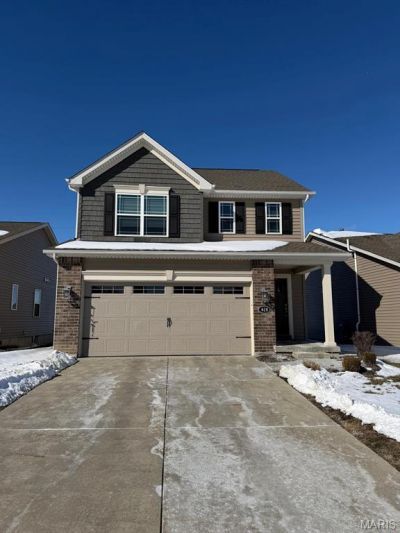 4 BD | 2.5 BA | 1.5-Story | 1,790 Sq FtWelcome home to this beautifully maintained 6 year young home, 1.5-story in the highly desirable Charlestown Place neighborhood! Enjoy a low-maintenance lifestyle with lawn care, irrigation/sprinkler system maintenance, and snow removal included in the HOA fee of 100$ per month.Tucked away on a quiet cul-de-sac, this home backs to common ground with a water feature and offers a playground right on the street. Inside, you'll find an open, inviting floor plan featuring 42 cabinets with hardware, a center island with seating bar, solid-surface countertops, stainless steel appliances, tile backsplash, transom windows, and Low-E windows. Sale Includes brand new refrigerator and washer & dryer -both appliances are just over a year oldThe main-floor primary suite is a standout with raised double-bowl vanities and a walk-in closet. Upstairs offers three spacious bedrooms, a full bath, and an additional large walk-in closet.The exterior impresses with brick and vinyl siding with shake accents, plus a 2-car garage. Step outside to a patio overlooking the level backyard backing to common ground. The full basement includes a bath rough-in and egress window, making future finishing easy.Freshly painted in 2024 and ideally located with quick access to Hwy 370, restaurants, parks, New Town, Historic Main Street, Frenchtown, and Lambert International Airport. Located in the sought-after Orchard Farm School District.So much to love - don't miss this one!